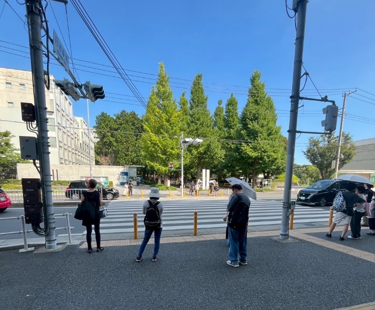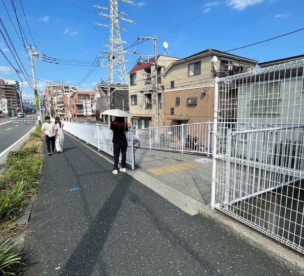1.改札を出て右に慶應義塾大学方面に横断歩道を渡り、左に進む